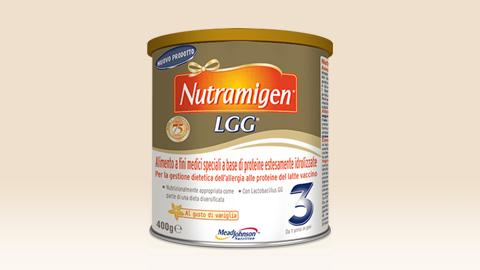 Nutramigen LGG® è una combinazione unica di Nutramigen e del probiotico Lactobacillus rhamnosus GG (marchio registrato LGG®) e viene utilizzata per la gestione dietetica dell'allergia alle proteine del latte vaccino da lieve a moderata.